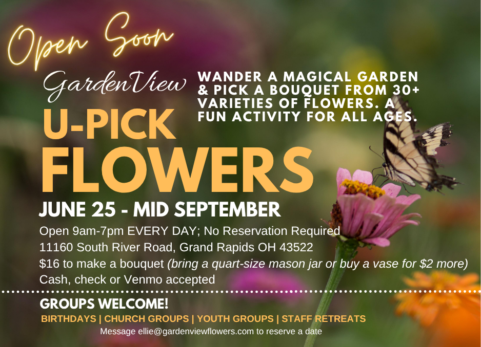 When you arrive at the GardenView, you’ll check in at our In Season Flower & Gift Shop, fill your mason jar (Ball brand quart-size mason jar) or vase (available to purchase) with water, and pick up to fill a set of clippers for picking blossoms. When you’re finished filling your cup, you’ll return your clippers. All clippers will be sanitized in between uses. Check out these features by The Blade & Sentinel -Tribune for more on the GardenView U-Pick experience.